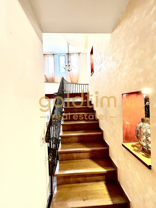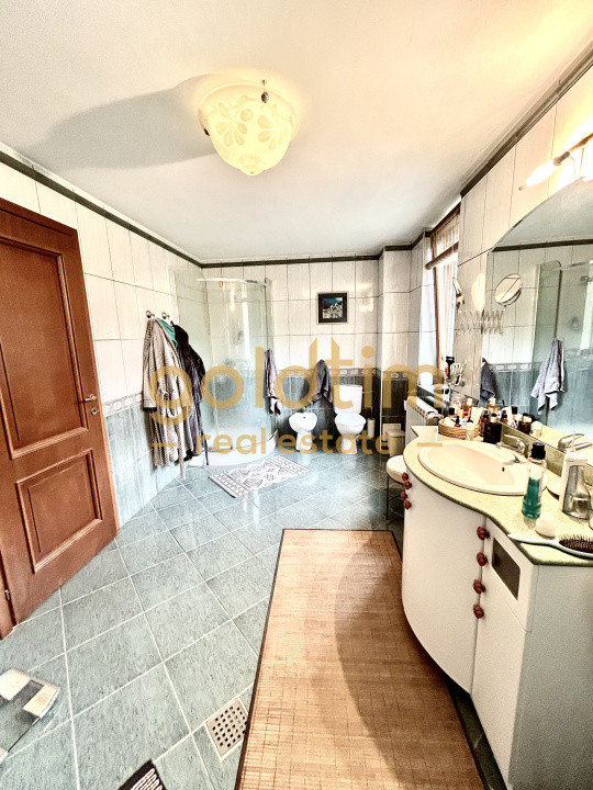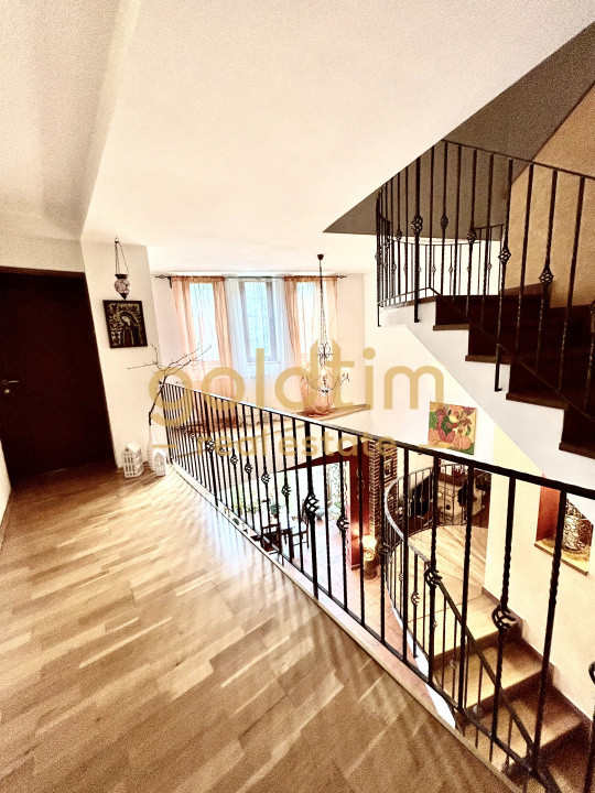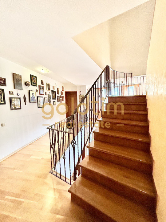 Accesul la etaj se face printr-o scara superba in semicerc, placata cu lemn care ofera vedere si catre zona de living, un hol generos de 18mp extrem de luminos din care se acceseaza 3 dormitoare, camera dressing si 2 bai.