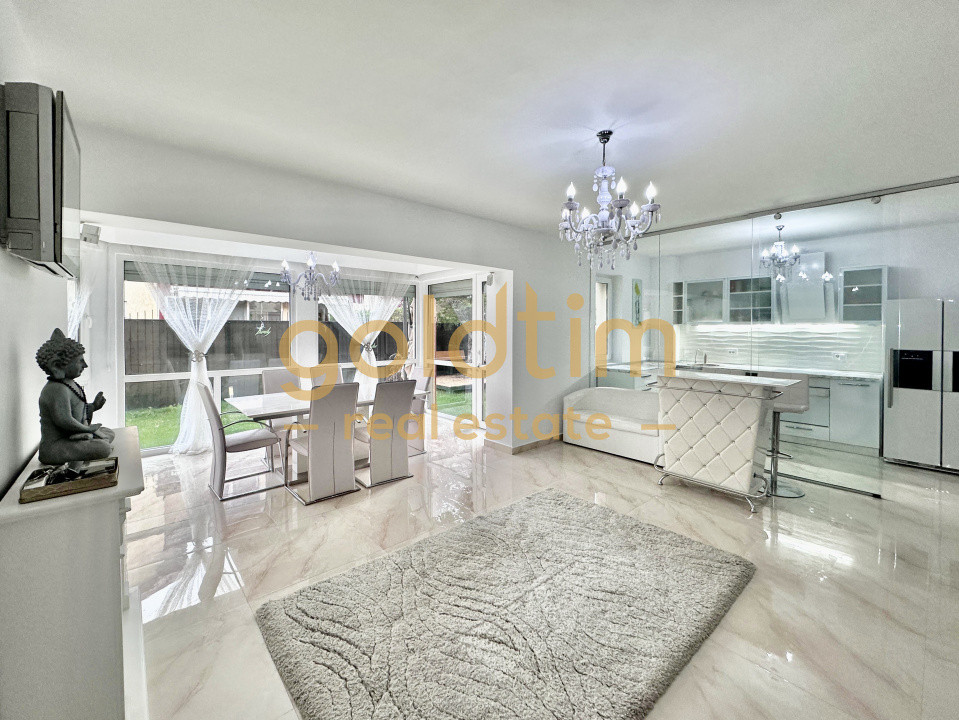 La parter 108mp se gasesc: Living si dining room, bucatarie inchisa cu perete de sticla,